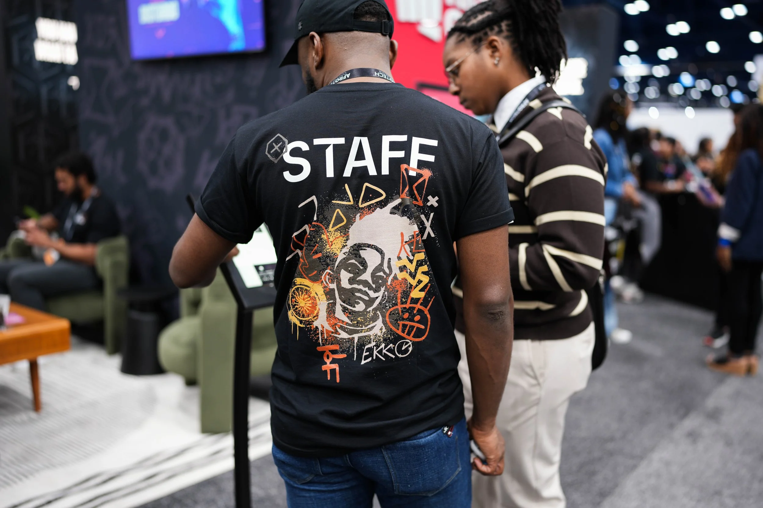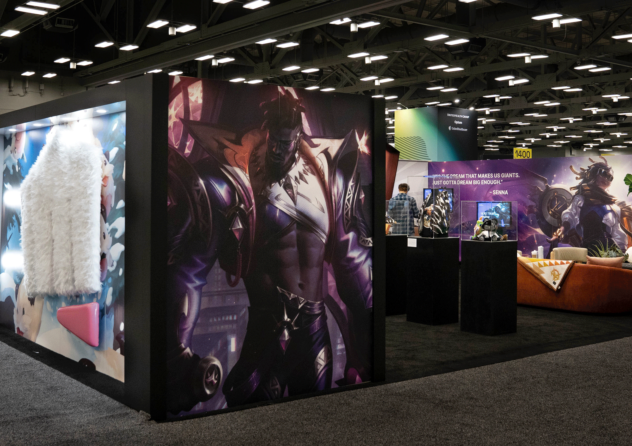 Our first fully custom booth made a strong impression with a giant lenticular wall that showcased Black characters from our IP on one side, and an Astra quote on the other. Guests were greeted by a large fuzzy Poro fist, and inside they could explore curated artifacts and relax in open seating areas while chatting with staff.