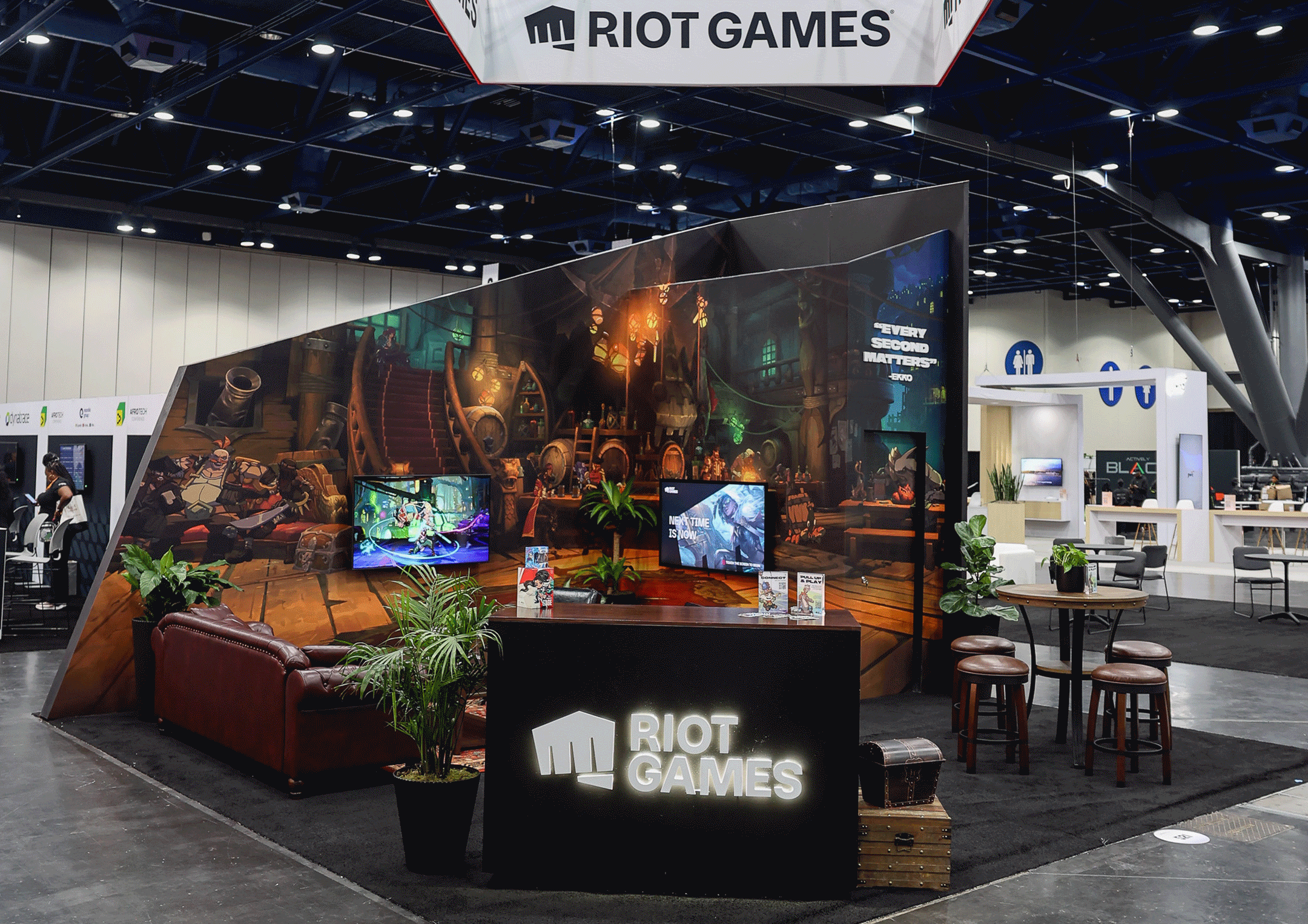 For 2025, we built a full 2XKO experience to spotlight Riot’s newly launched fighting game. A towering 9-foot Ekko and a 2XKO-themed Ekko fist set the tone outside, while the interior dropped attendees straight onto the Bilgewater stage with a fully matched backdrop and curated furniture.